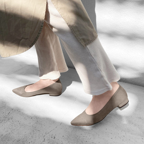 Simple pointed toe flat shoes accented with a large buckle on the toe with suede-like material. A pair of fashionable shoes with a combination of different materials for the shoe body and the buckle. An elegant pair that can be used not only for work but also for ceremonies.