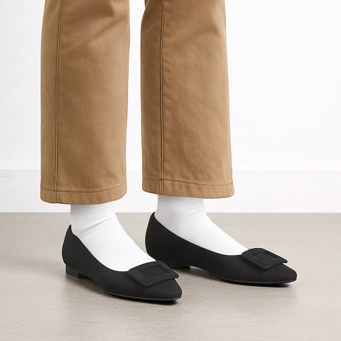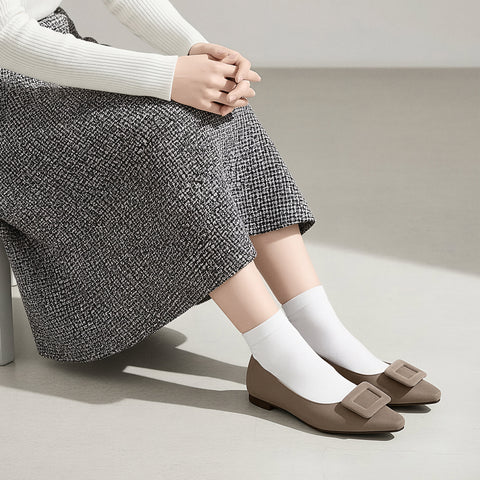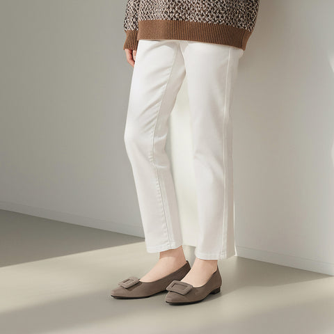 太めの筒でふくらはぎをカバーしつつ、トレンド感のあるスタイルを演出します。抜け感のあるストレートラインが美脚効果をもたらし、長め丈スカートとの相性も抜群です。フラットヒールで足が疲れにくく、細長スクエアトゥで足先も快適に過ごせます。
